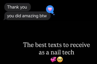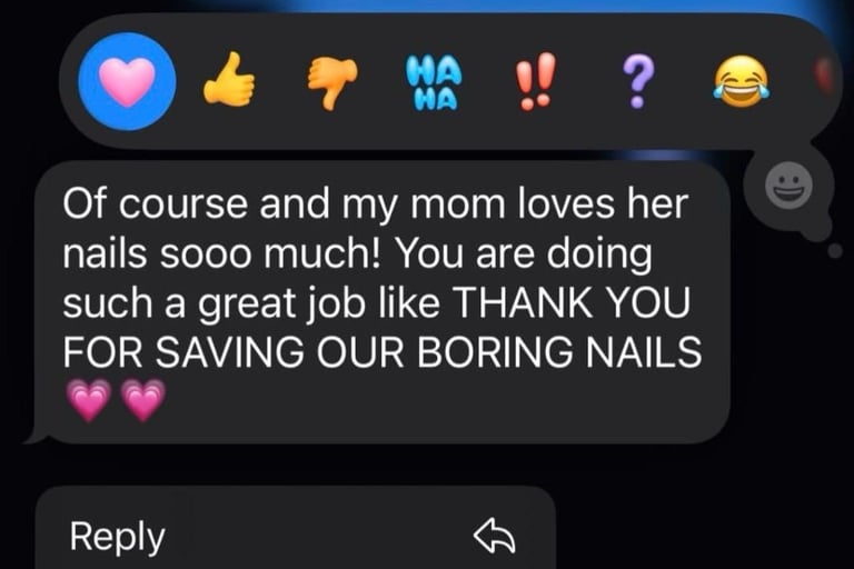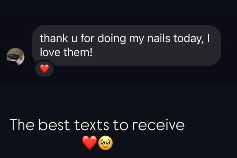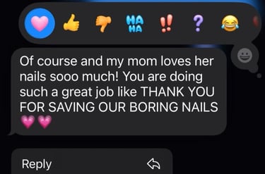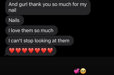 Doing nails isn’t just a service to me — it’s a creative outlet and a way to help people feel confident and cared for. Every set is crafted with patience, precision, and a touch of personality.